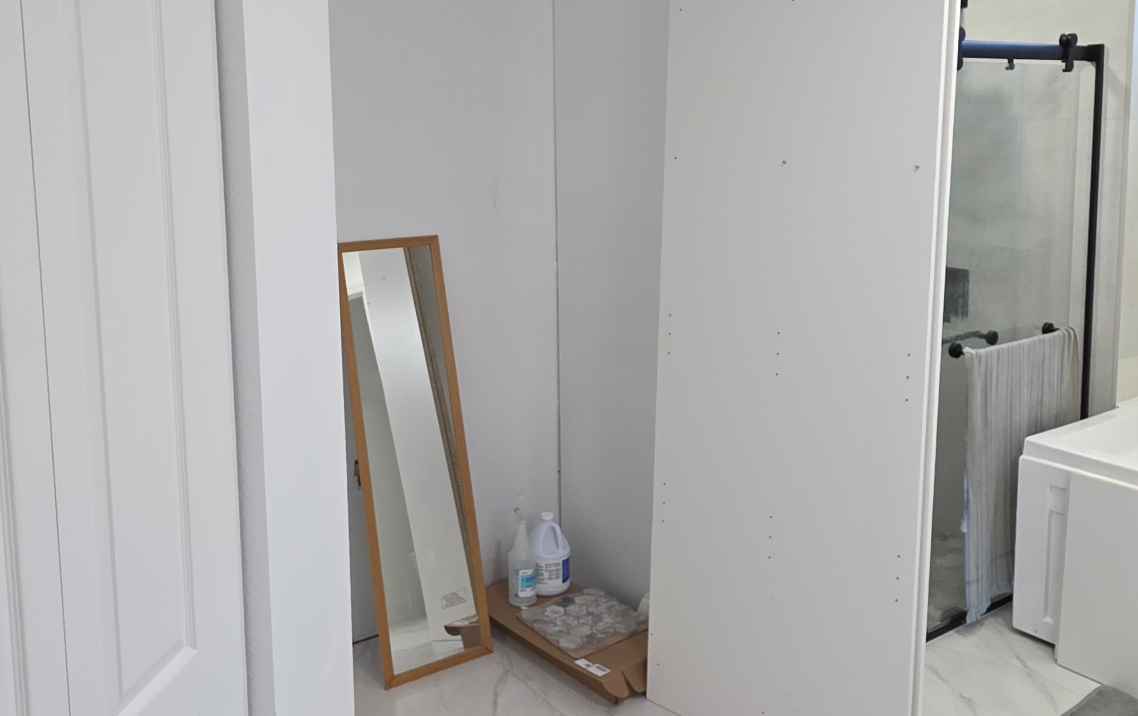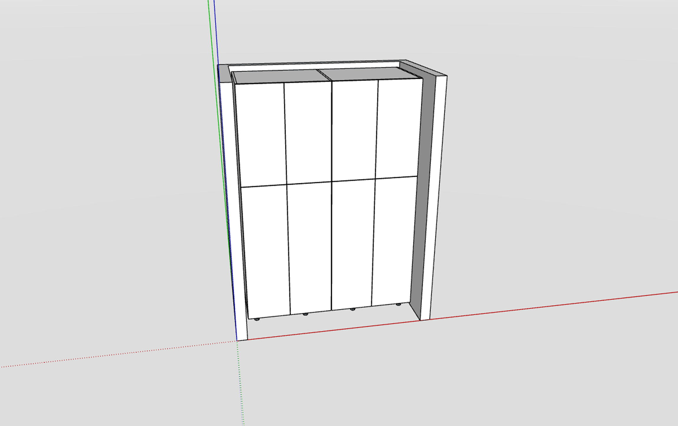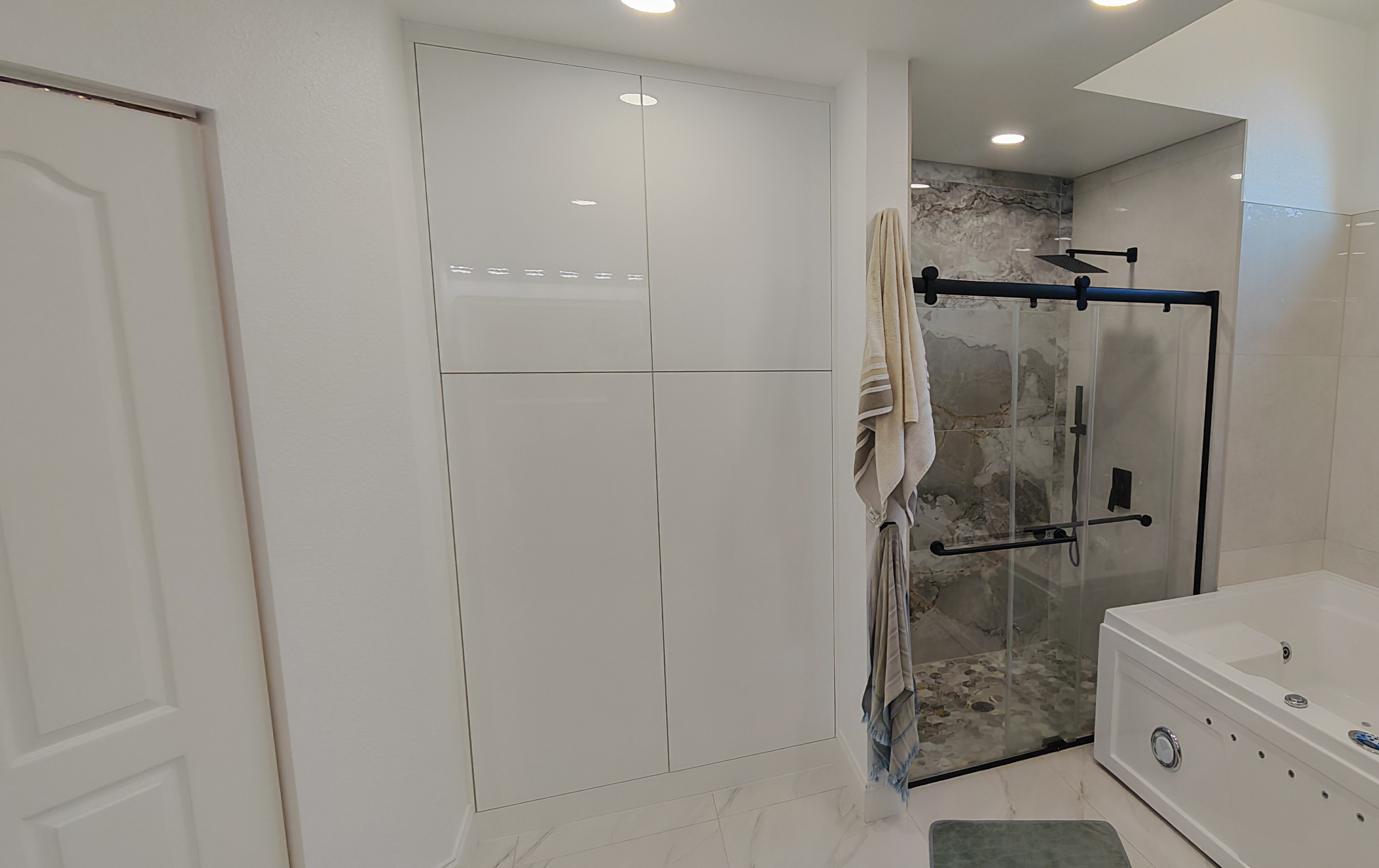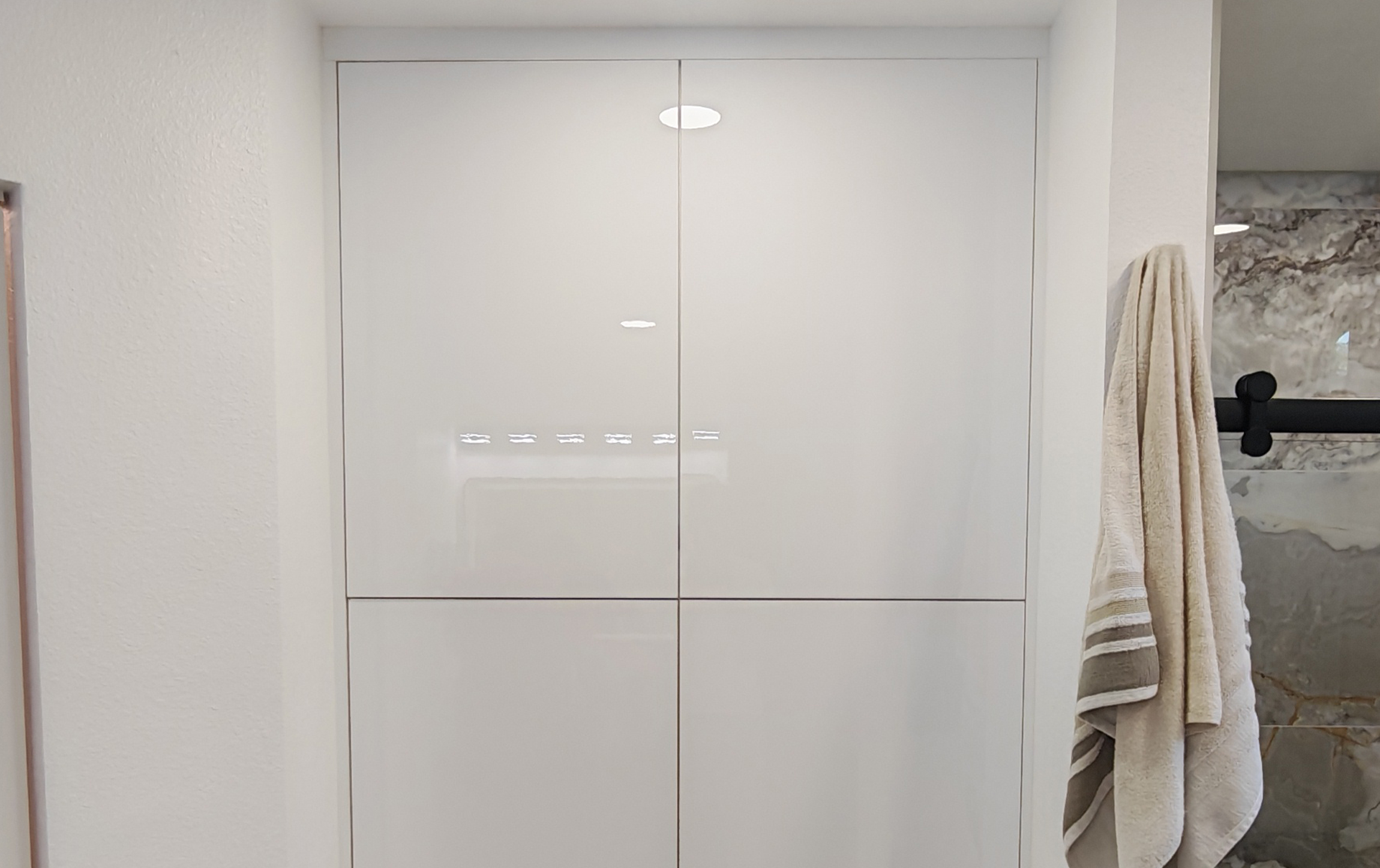 The cabinet is integrated into the wall and wrapped with filler panels, creating a fully built-in, seamless look from floor to ceiling. Inside, the unit is designed as a functional storage solution with shelving, while on the outside it reads as a minimal, monolithic surface — suitable for living areas, closets, hallways or bathrooms where you want both storage and a sleek, furniture-like appearance.