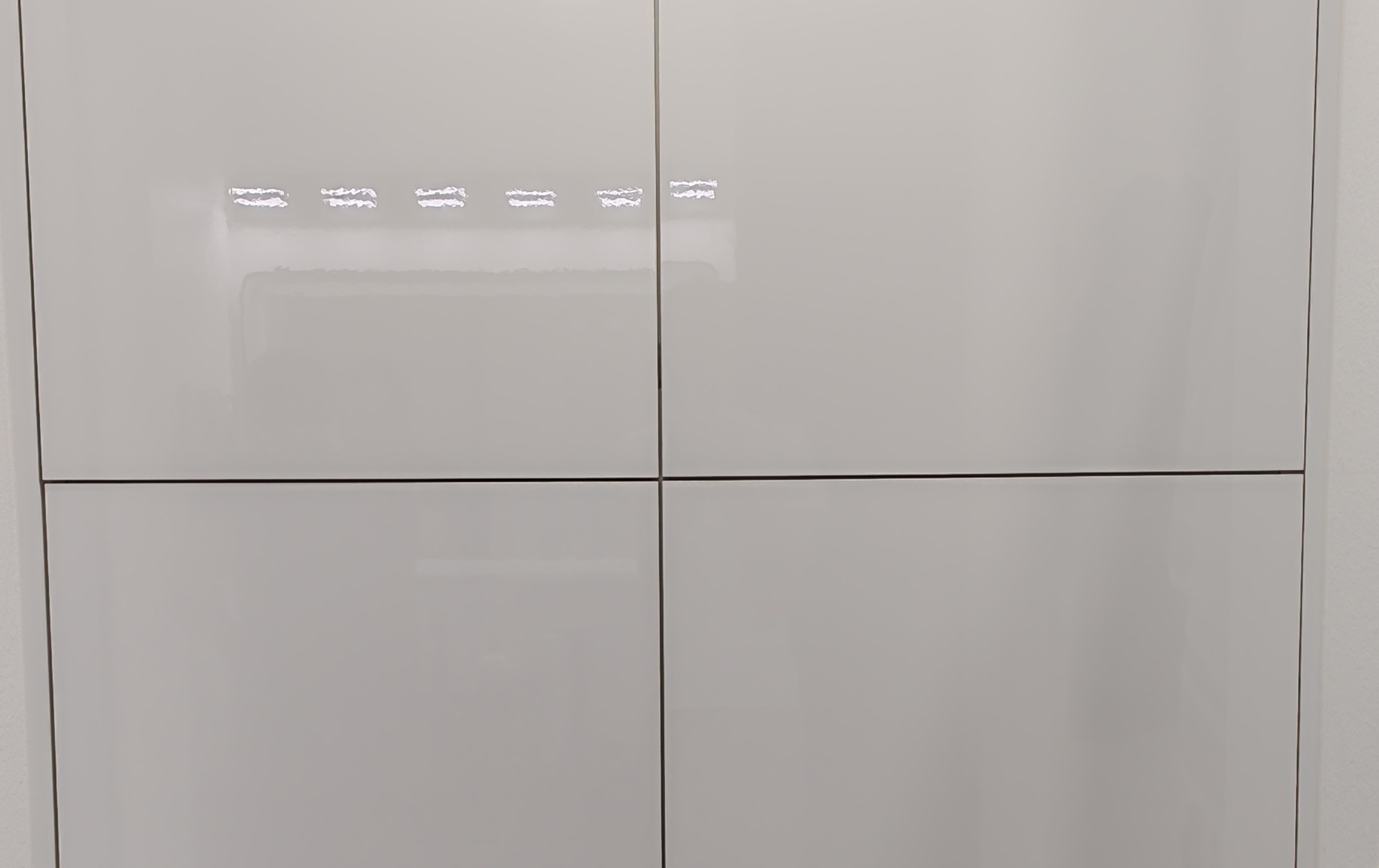 This custom frameless storage cabinet is built as a clean, modern piece with four high-gloss flat-panel doors and a push-to-open system instead of handles. Each door is mounted on soft-close hinges, providing smooth, quiet closing and protecting the fronts over time.