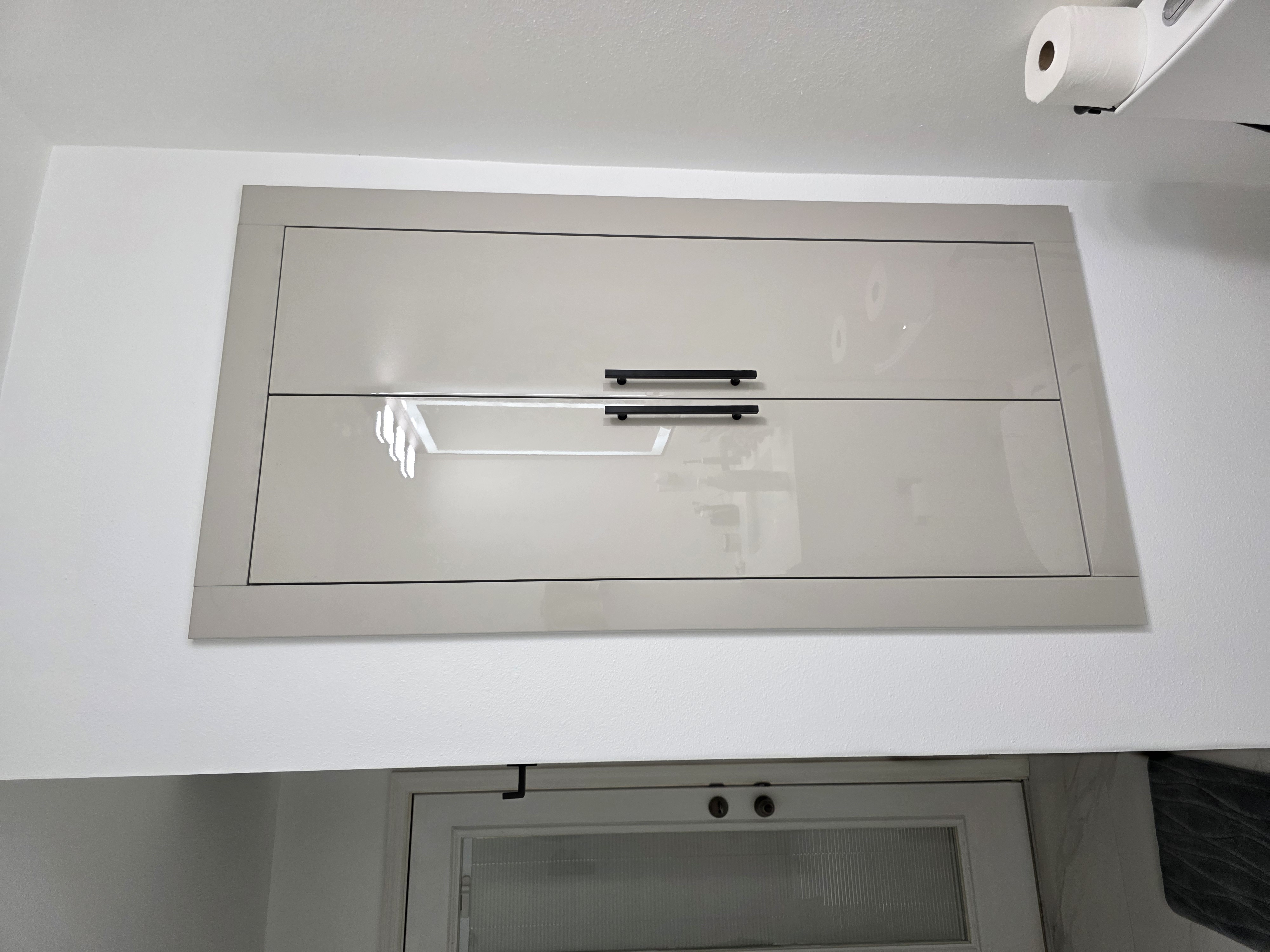 For this small bathroom we turned an empty wall niche into a fully built-in storage cabinet with frameless construction and sleek high-gloss doors. The cabinet sits flush with the wall, giving lots of hidden storage without taking up floor space, and the modern handles match the vanity hardware so the whole room looks like one clean, custom set.