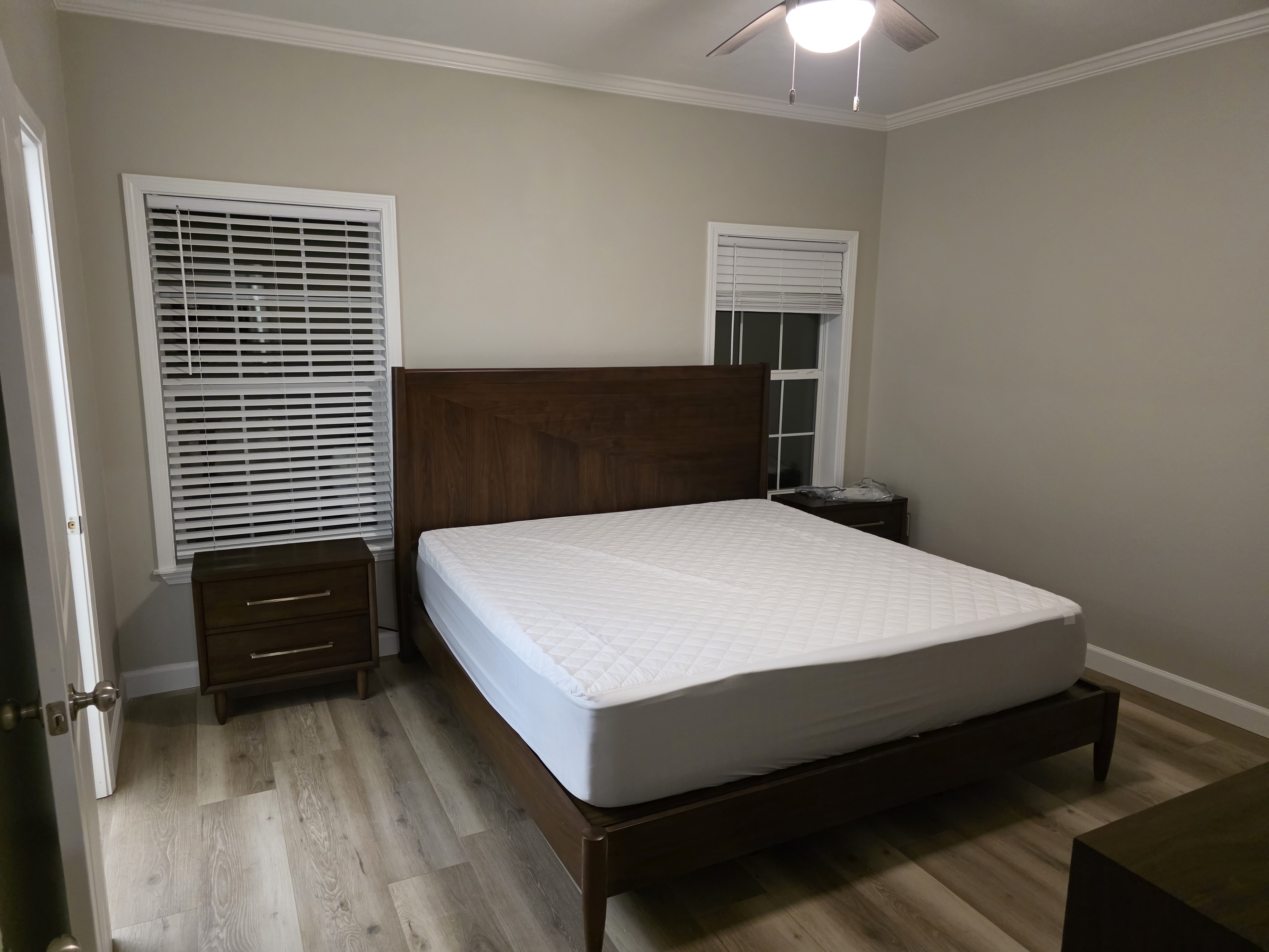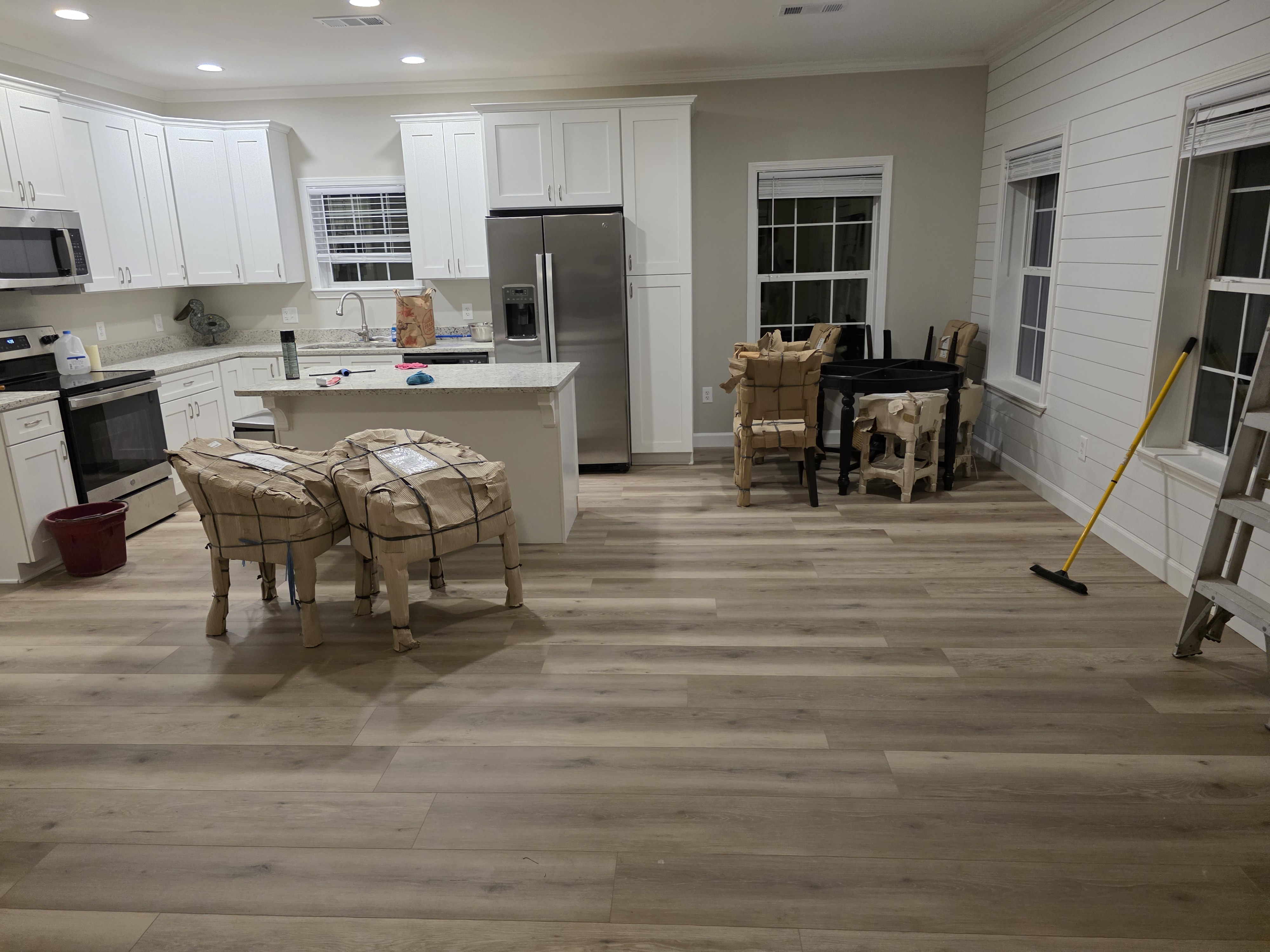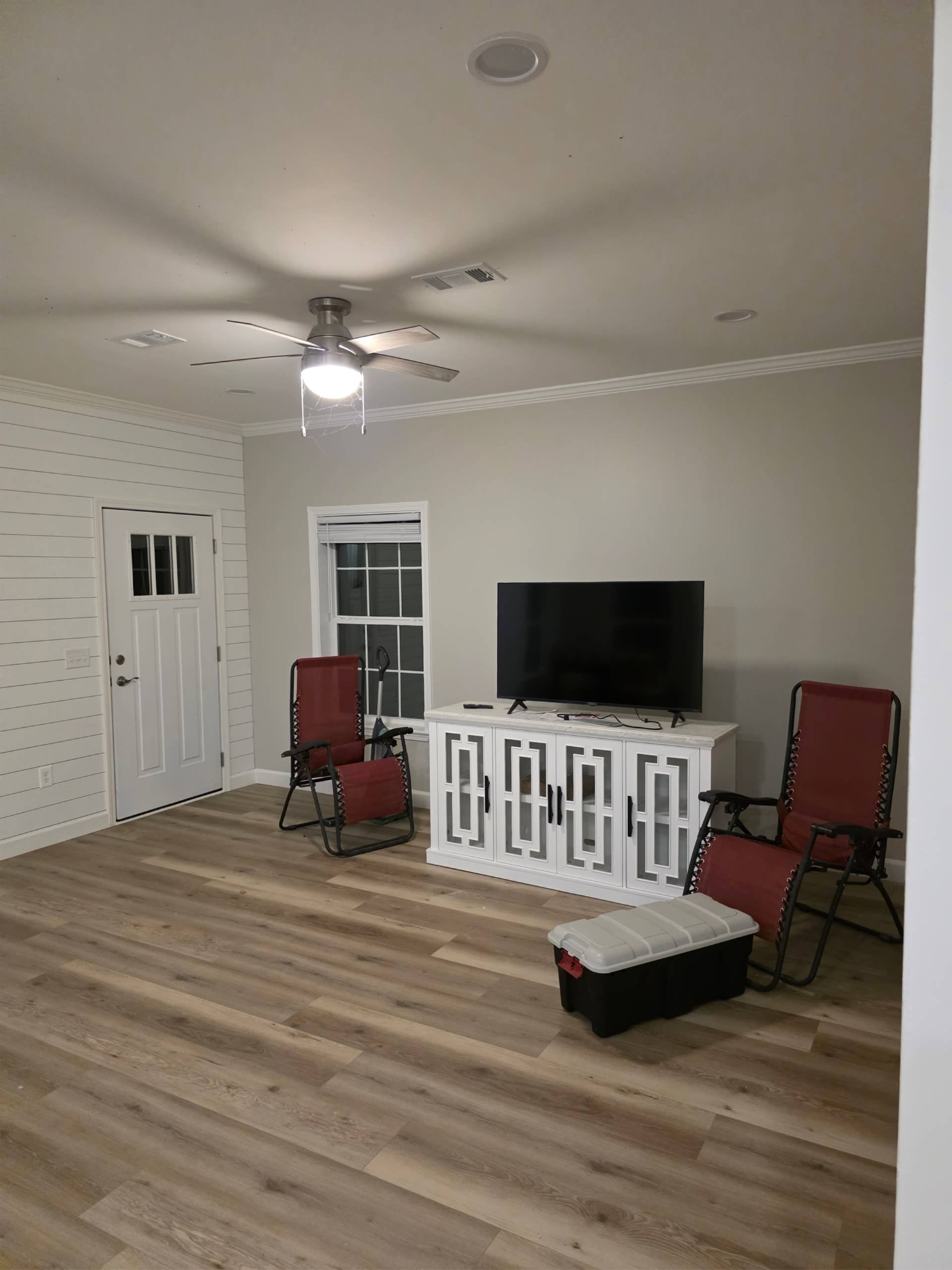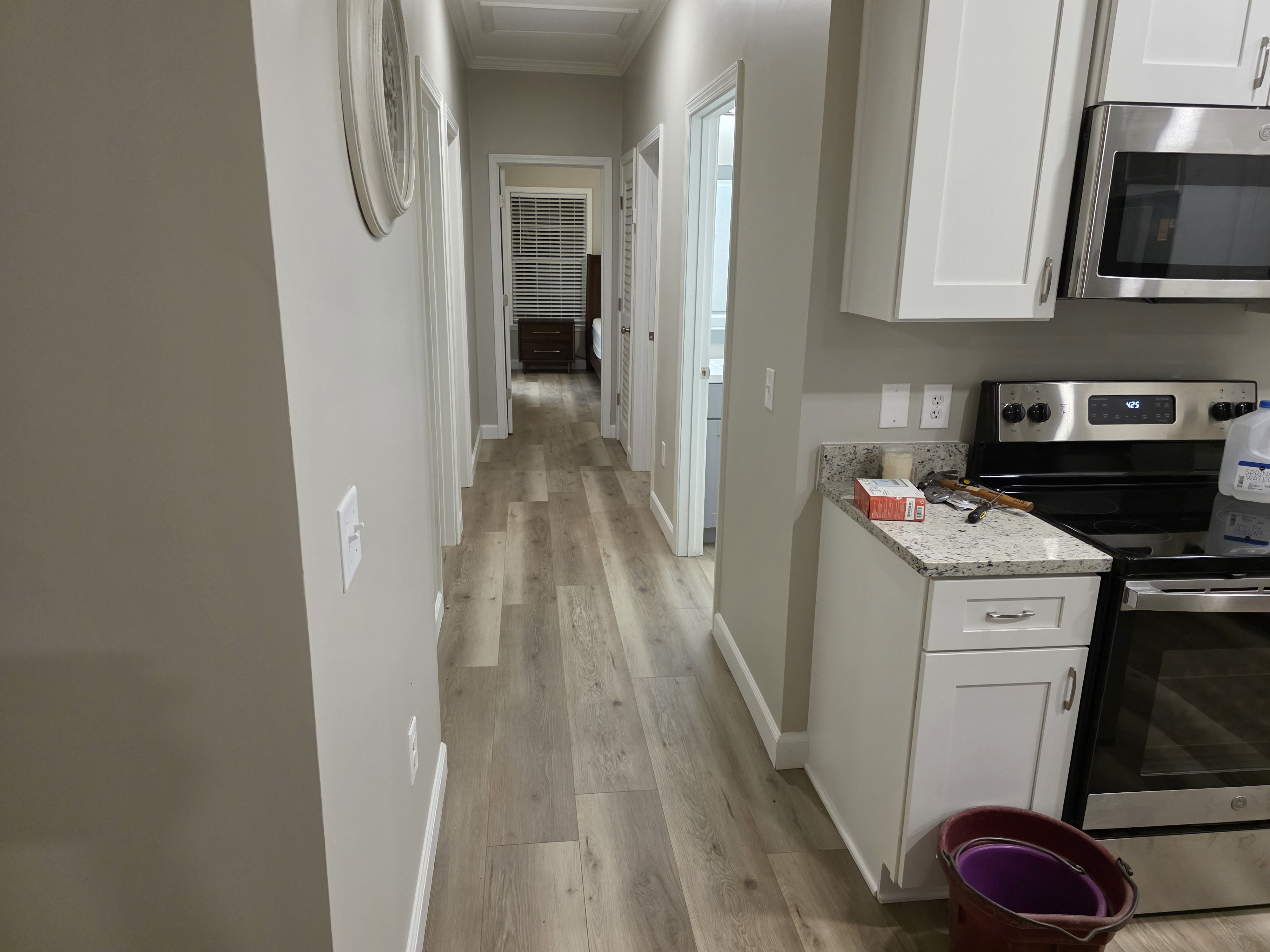 After the new manufactured home was set and connected, our team completed a full interior trim-out. We straightened and insulated the walls, repaired factory seams and ceiling joints, installed new interior doors, casings, and baseboards, and finished all drywall with smooth painting. In the living room and hallway we laid durable LVP flooring, added decorative trim details, and left the owners with a clean, move-in-ready space that feels like a site-built home.