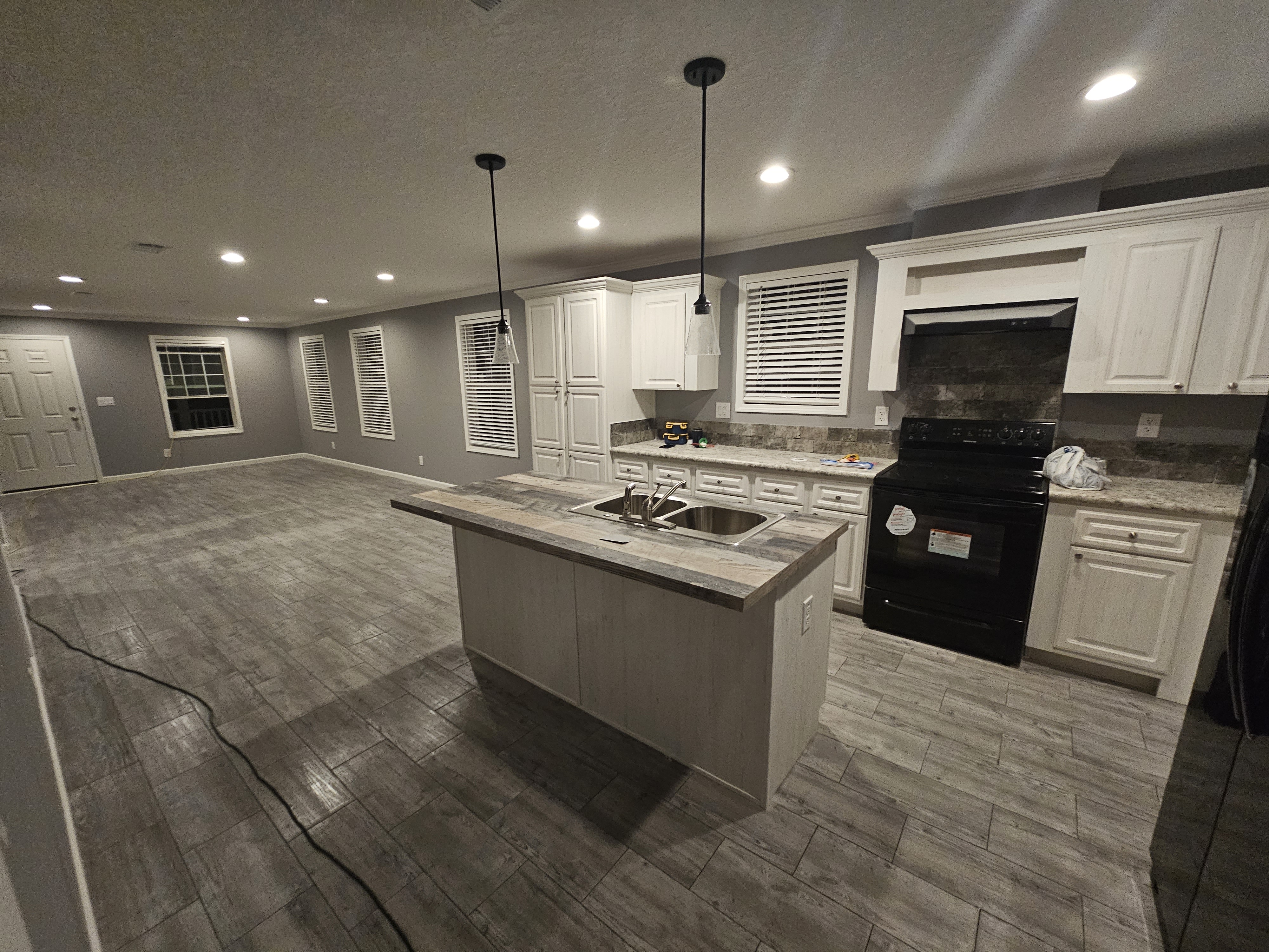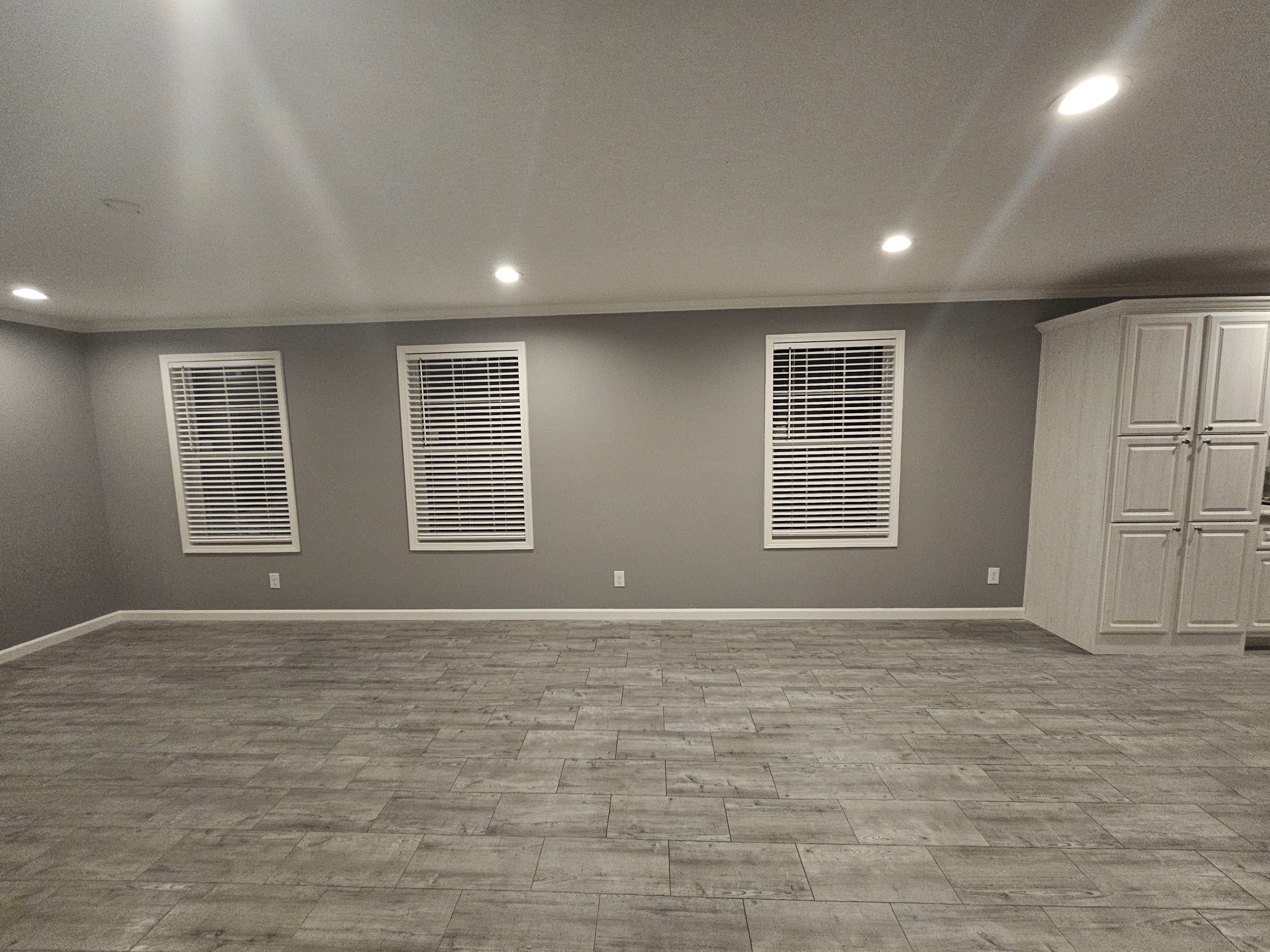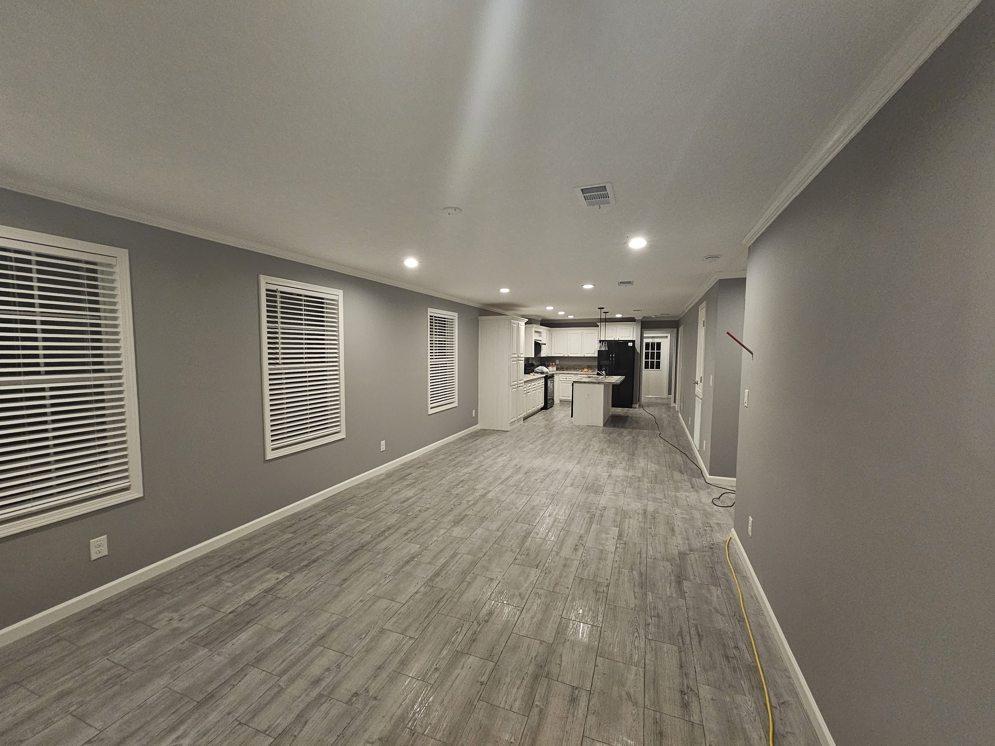 For this project we came in right after the new manufactured home was set and joined together on site. We finished all drywall seams, added texture, and painted the entire open-plan living and kitchen area in a modern gray. Our team installed new baseboards, window and door trims, and completed all ceiling details with recessed lighting and pendants over the island. After trim-out, caulking, and touch-ups, the space turned into a clean, move-in-ready interior that feels like a traditional site-built home.