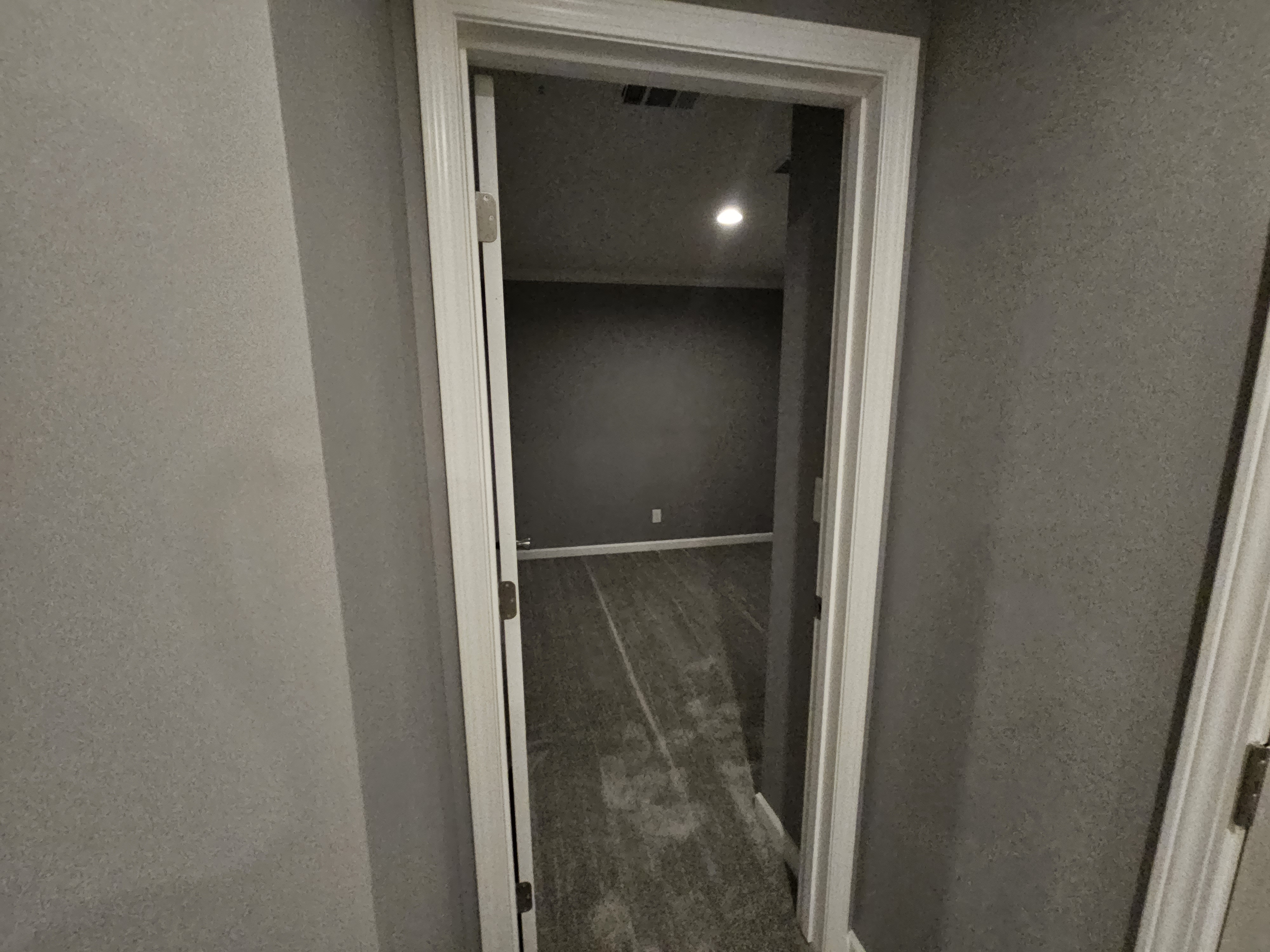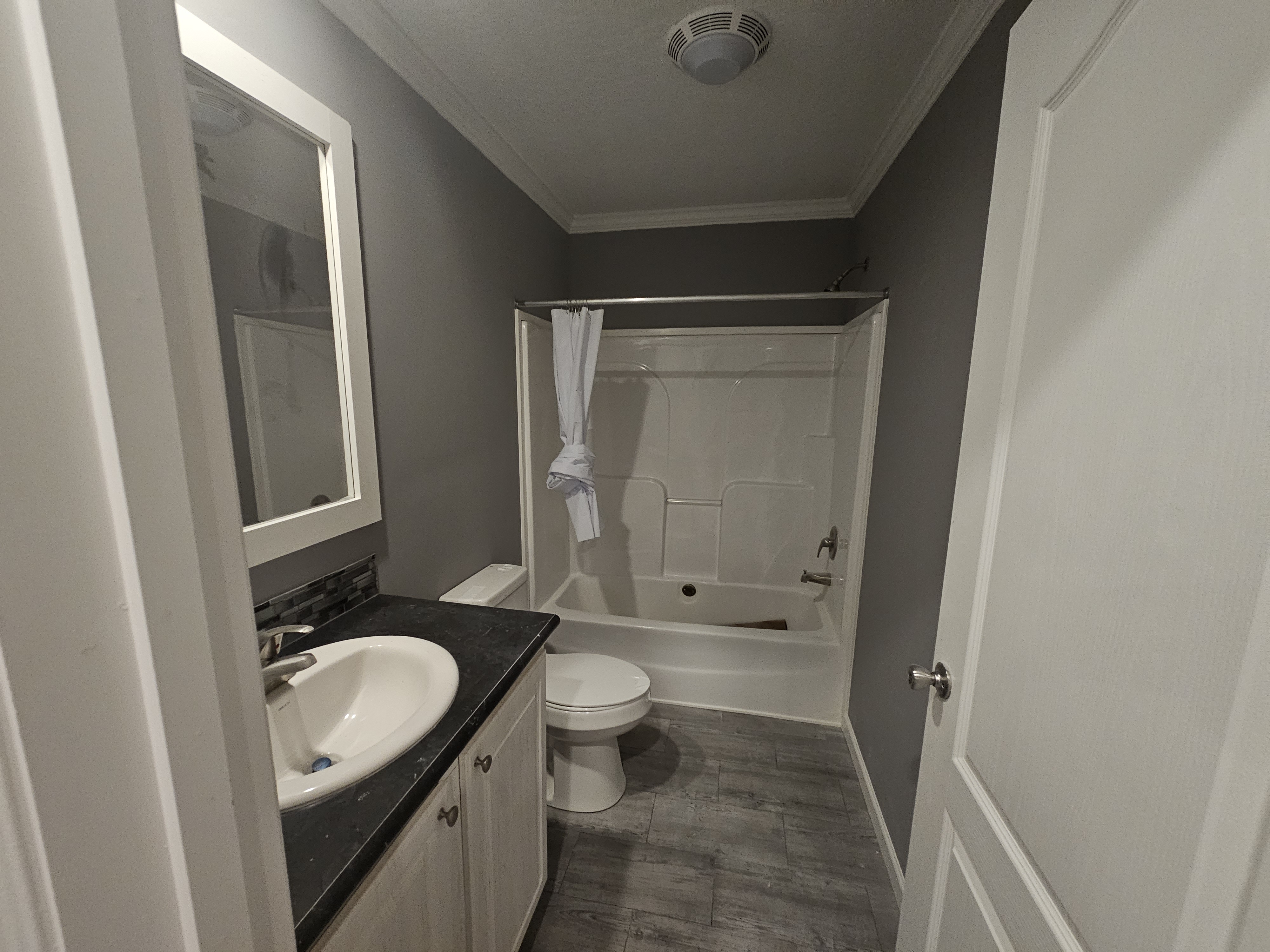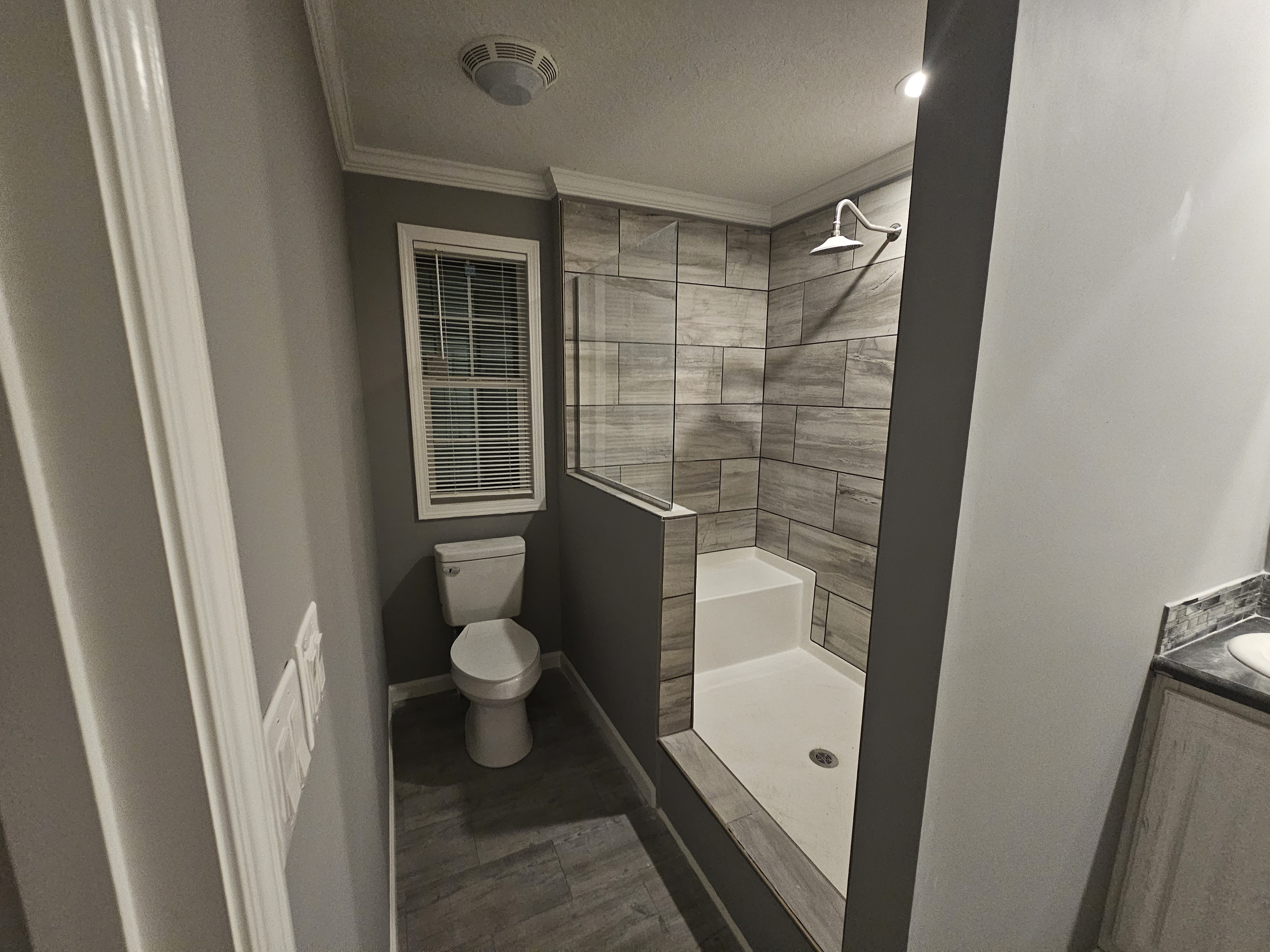 For this project we came in right after the new manufactured home was set and joined together on site. We finished all drywall seams, added texture, and painted the entire open-plan living and kitchen area in a modern gray. Our team installed new baseboards, window and door trims, and completed all ceiling details with recessed lighting and pendants over the island. After trim-out, caulking, and touch-ups, the space turned into a clean, move-in-ready interior that feels like a traditional site-built home.