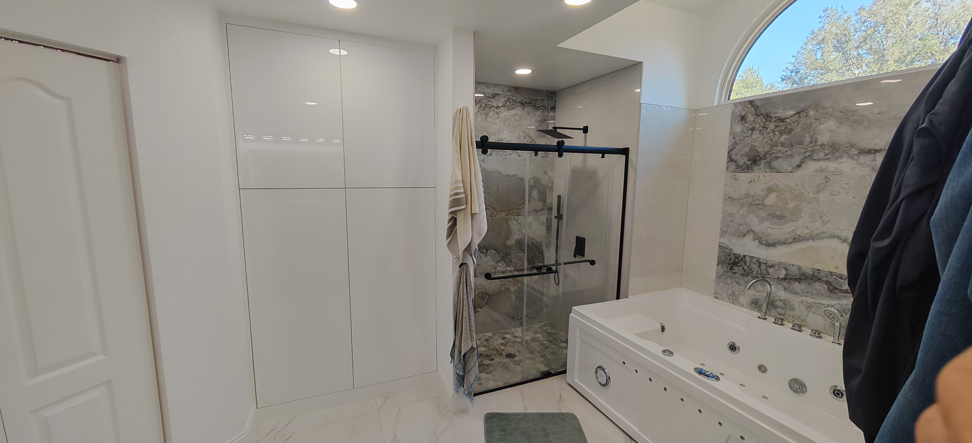 Built-in tall storage cabinet installed in place of the second vanity for better functionality and clean design.