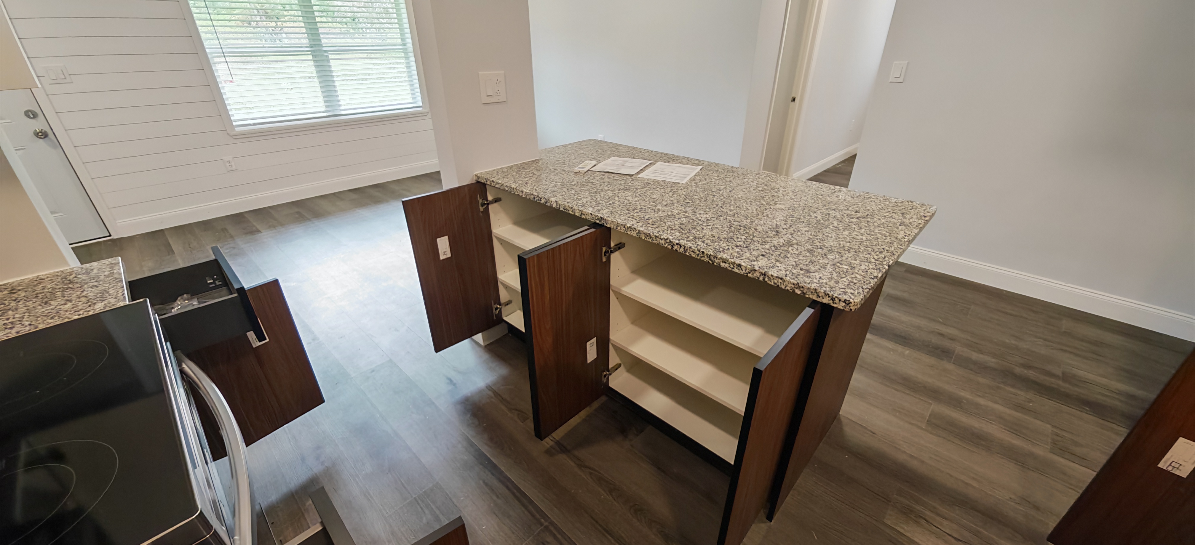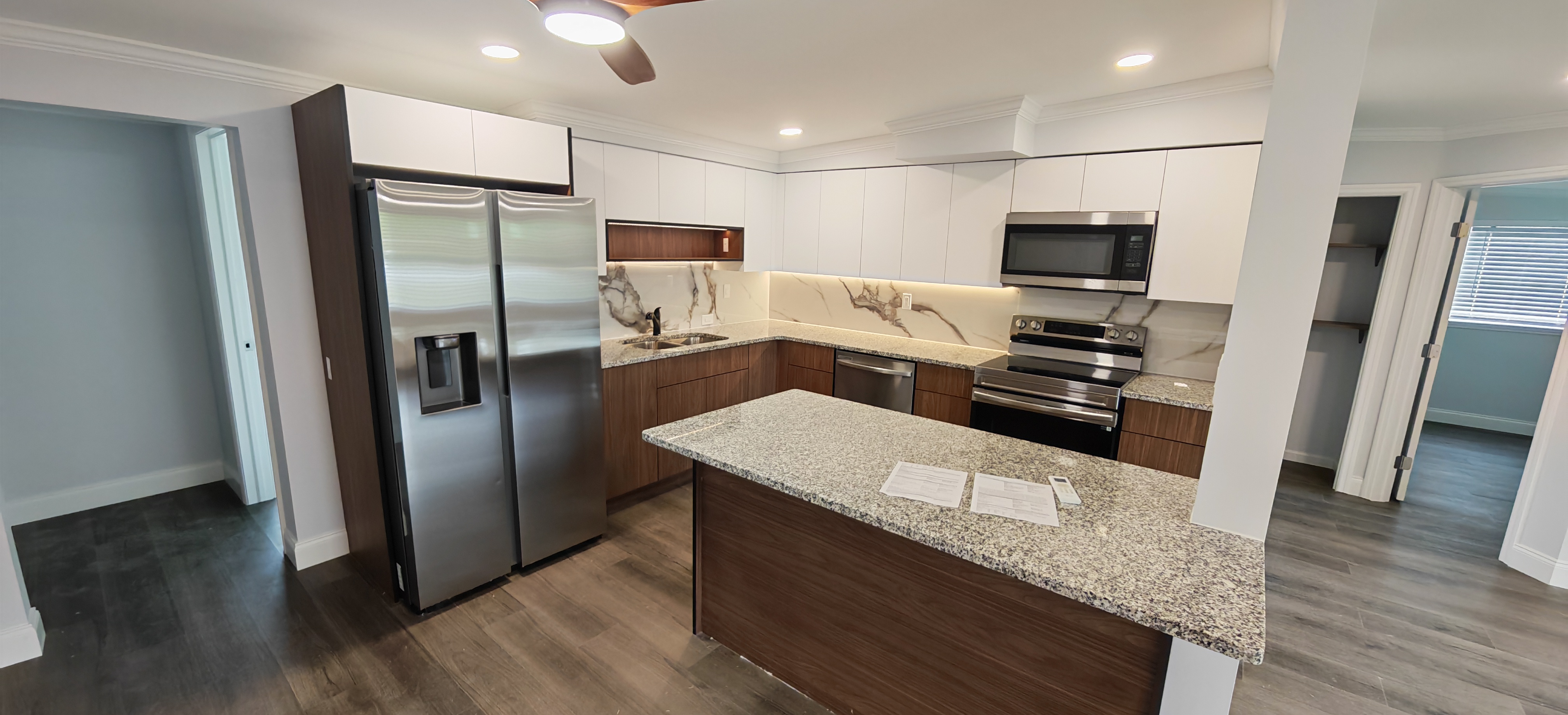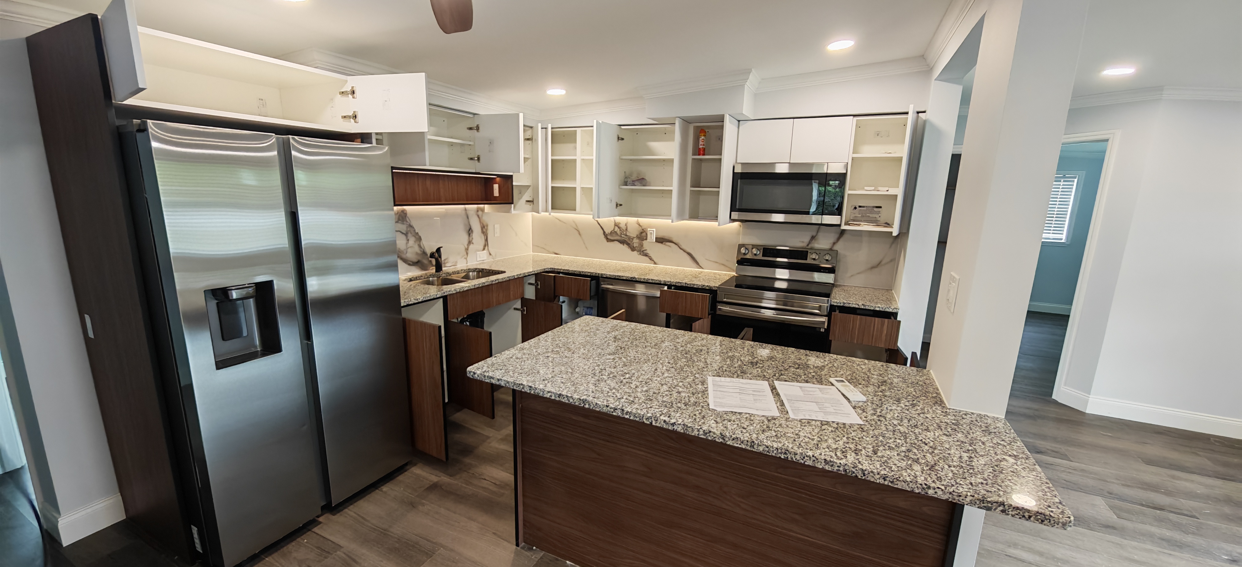 The layout includes a functional peninsula-style island for extra storage and countertop space, continuous upper and lower cabinets along the main wall, and integrated space for all major appliances. The result is a bright, practical kitchen with plenty of storage and a