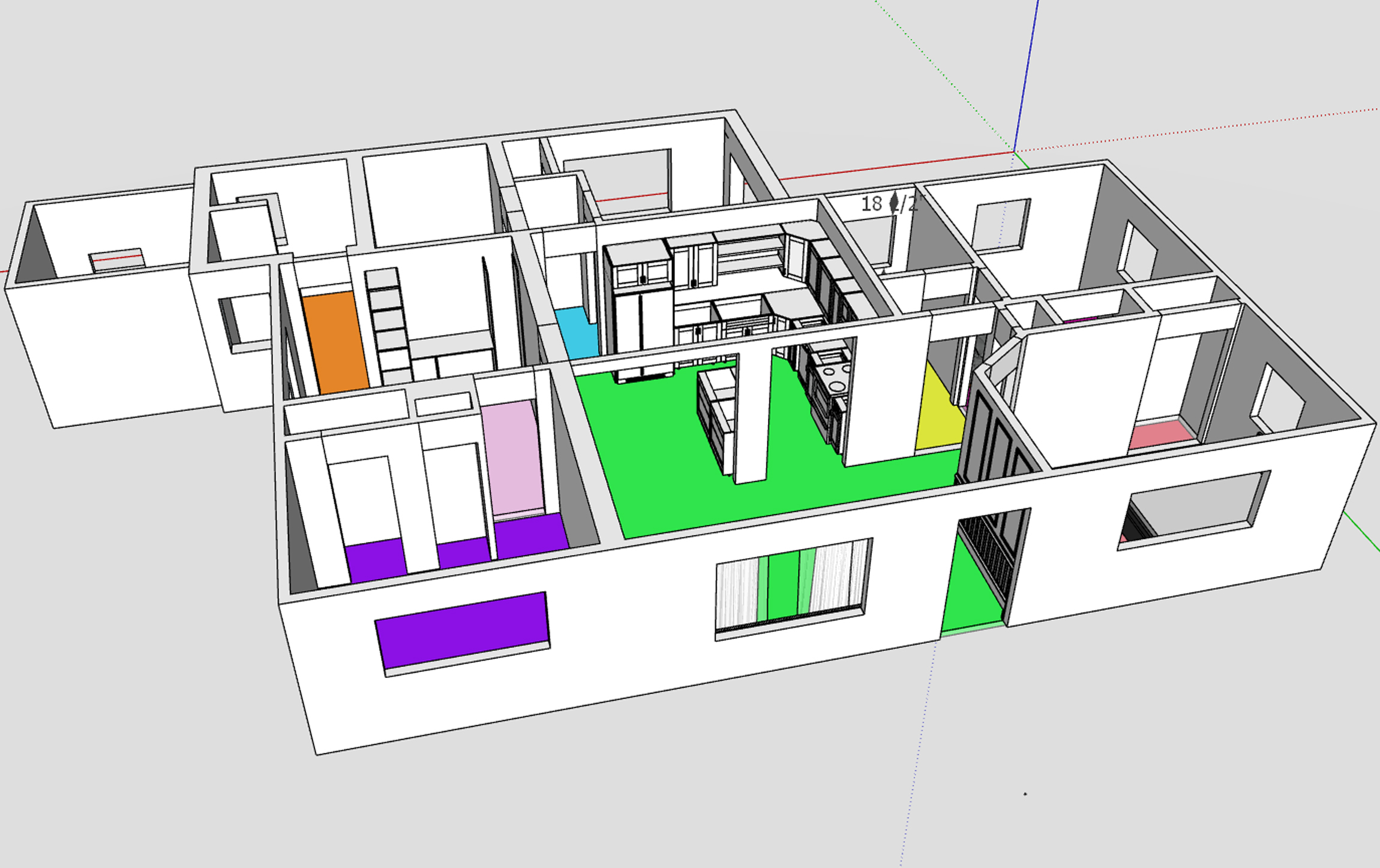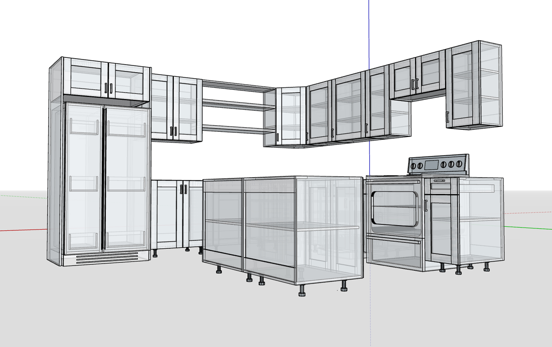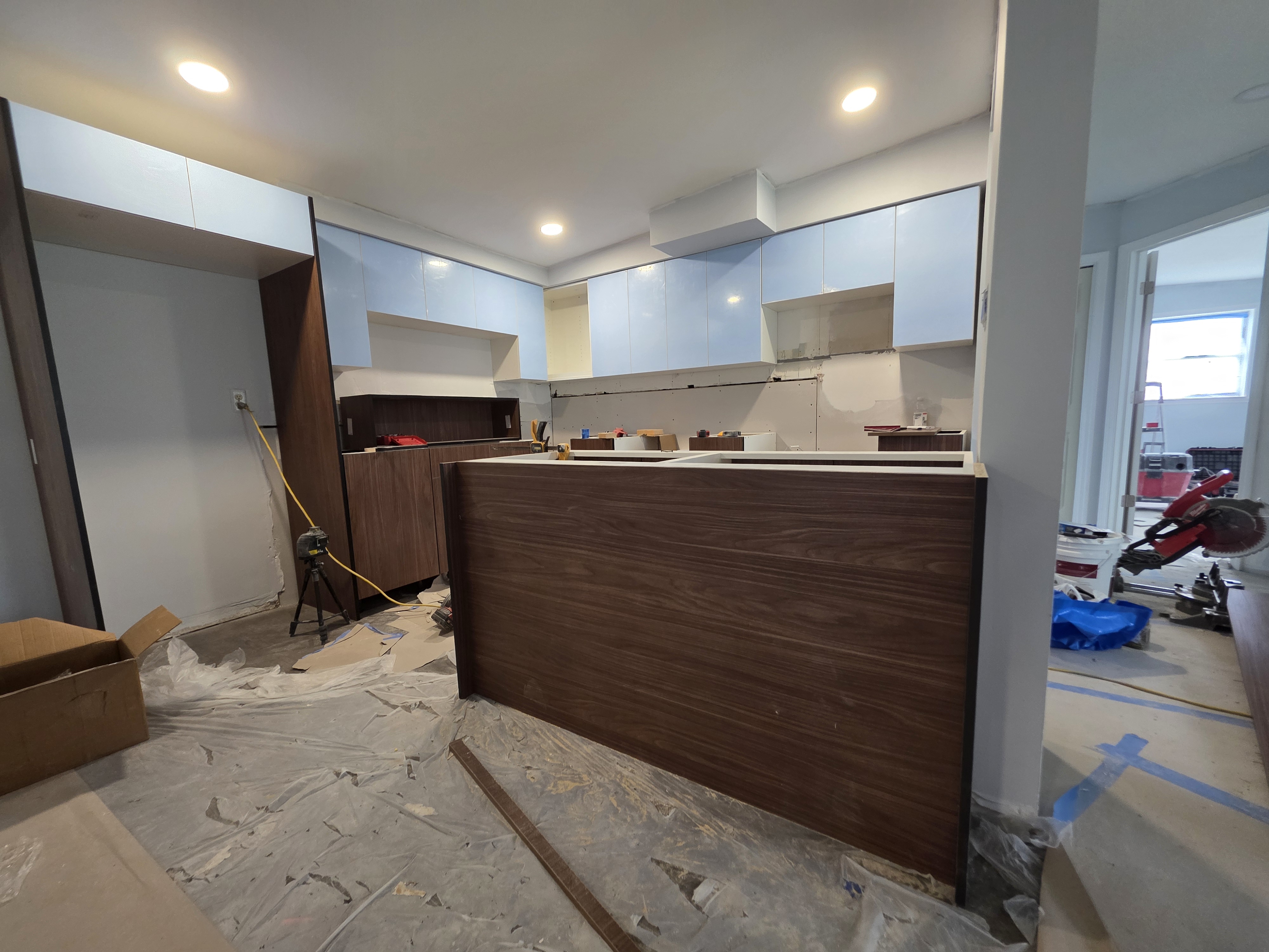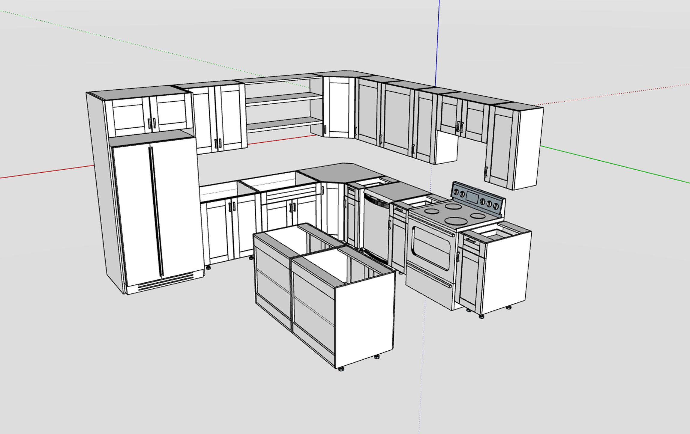The layout includes a functional peninsula-style island for extra storage and countertop space, continuous upper and lower cabinets along the main wall, and integrated space for all major appliances. The result is a bright, practical kitchen with plenty of storage and a