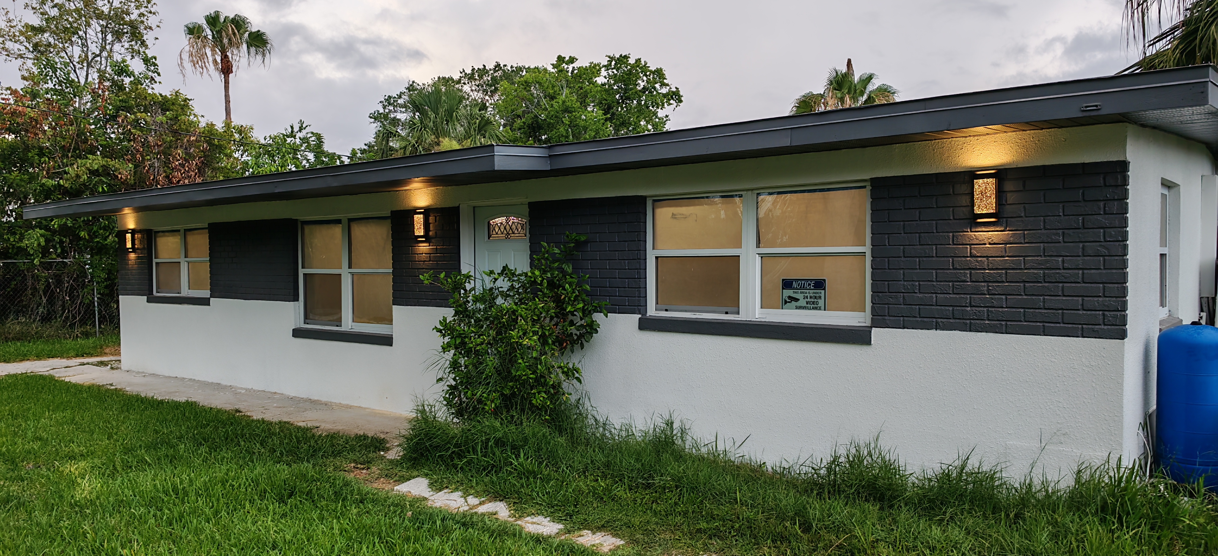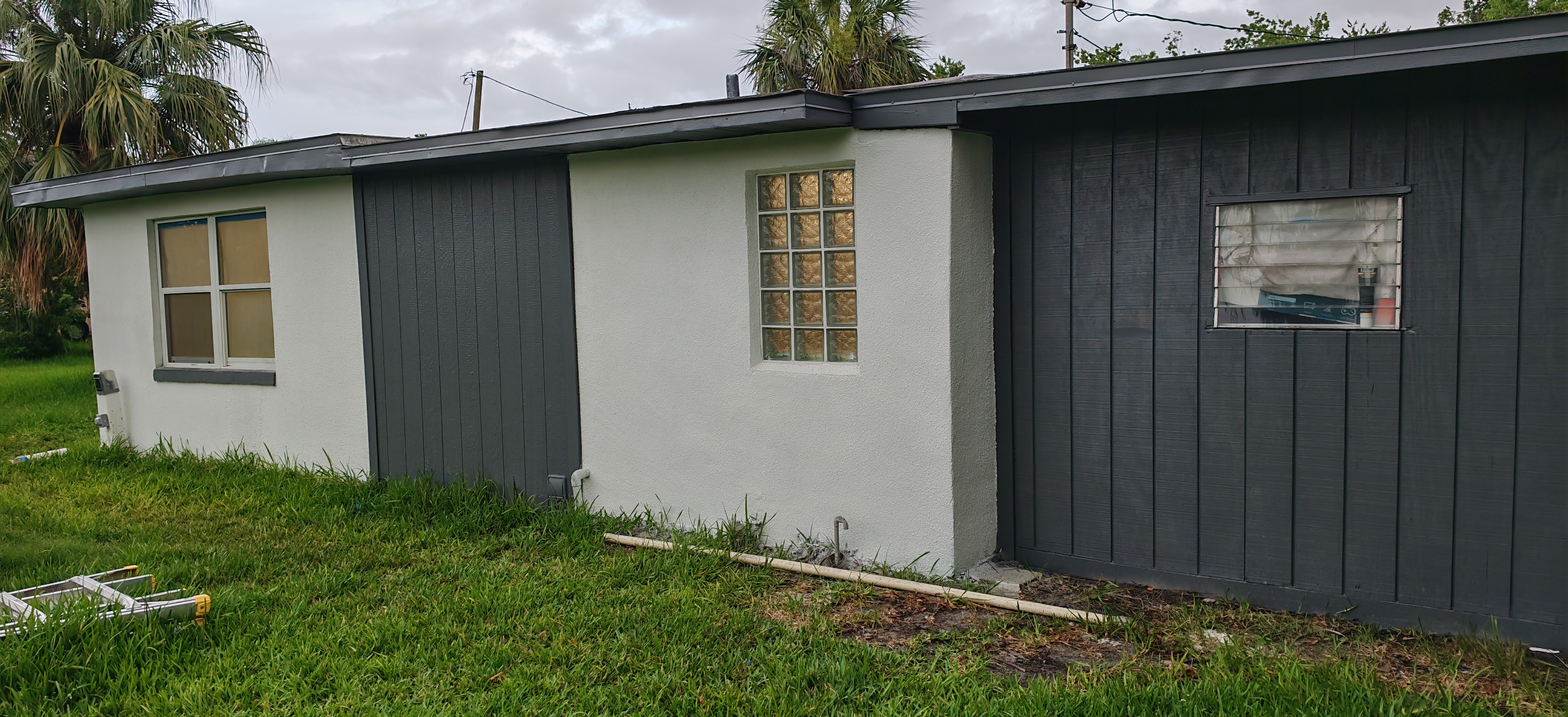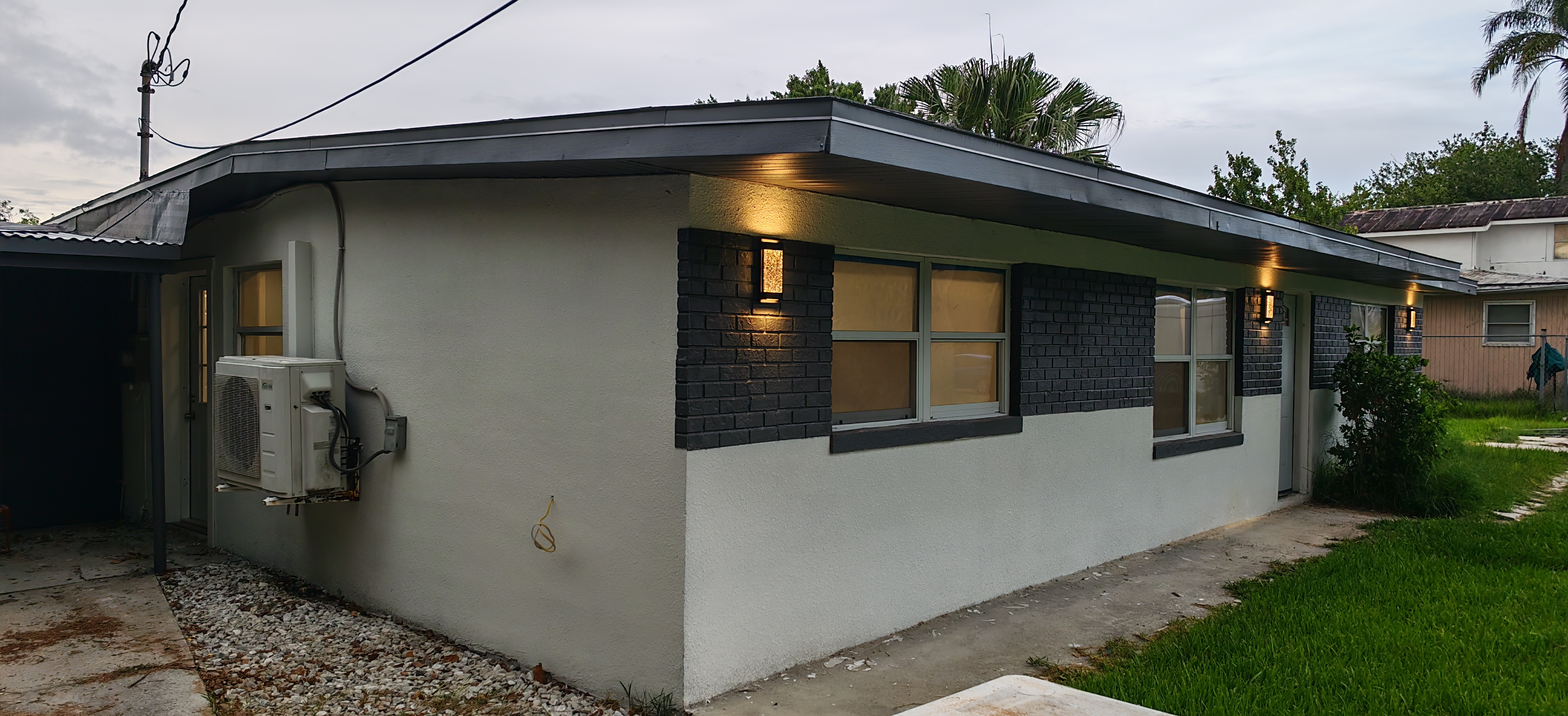 This exterior repaint completely refreshed the look of an older block home. We prepared the surfaces, primed, and applied a high-performance exterior paint system suitable for Florida sun, rain, and humidity. A light main color brightens the façade, while the dark accent on the brick and fascia adds contrast and a more contemporary, horizontal feel. Newly painted trims and coordinated wall sconces finish the composition, boosting curb appeal and protecting the exterior for years to come.