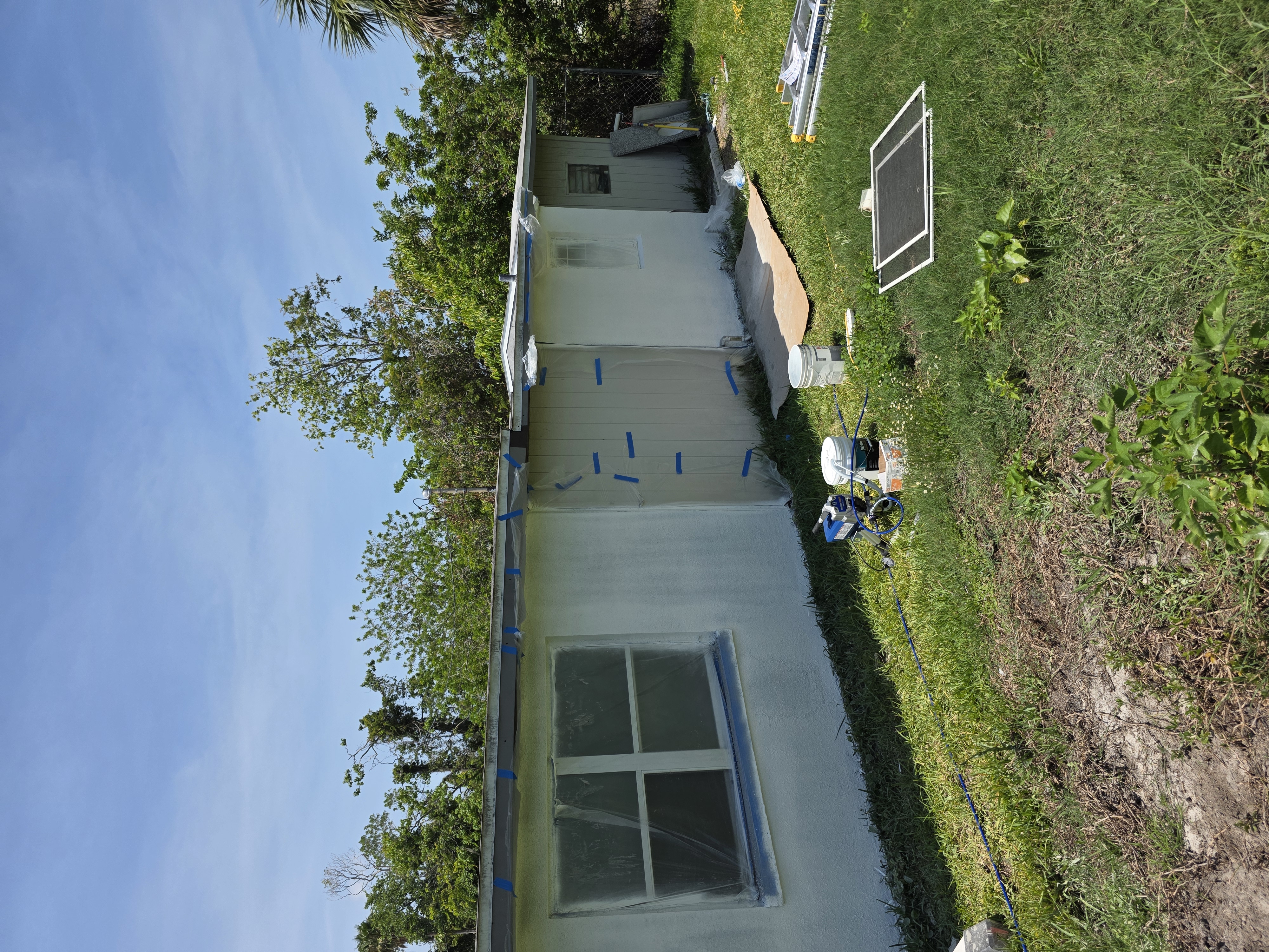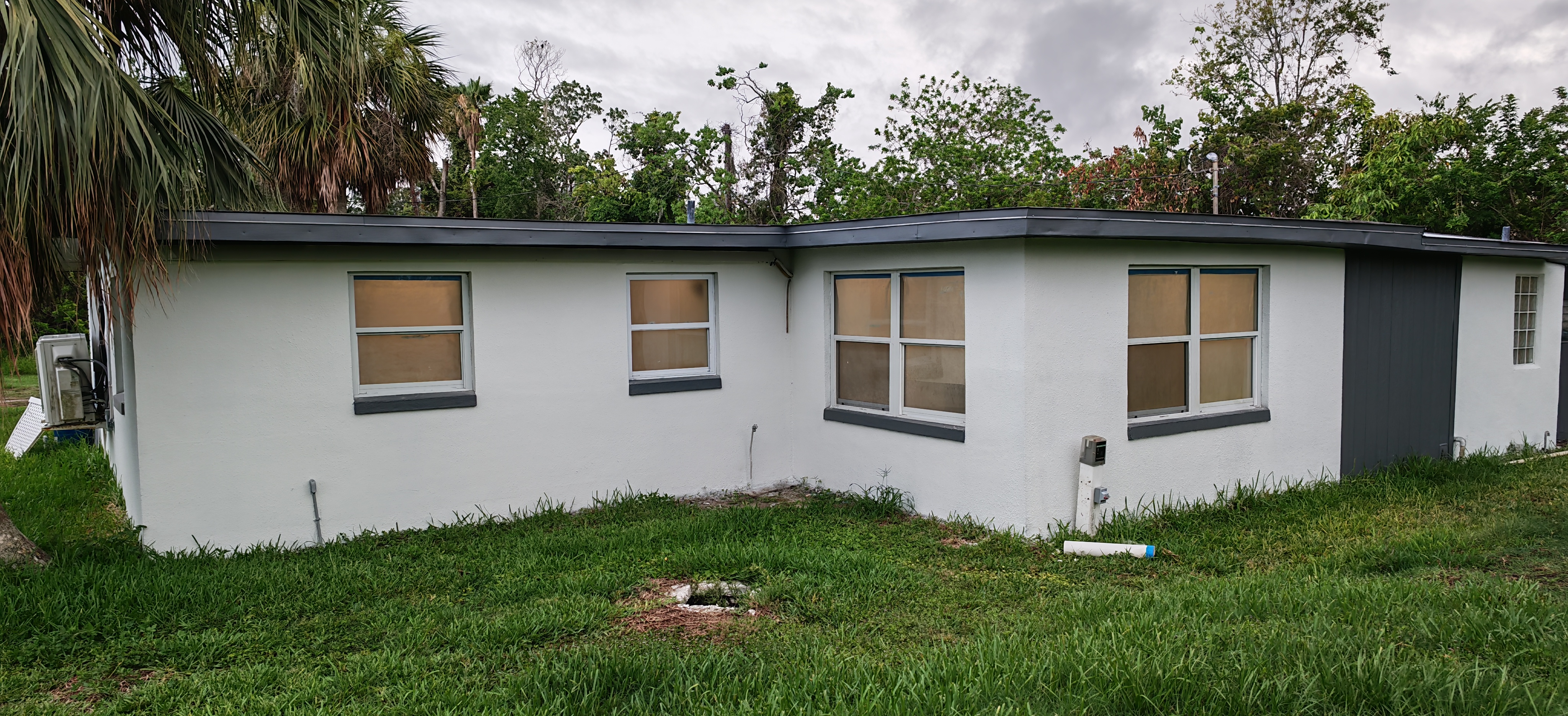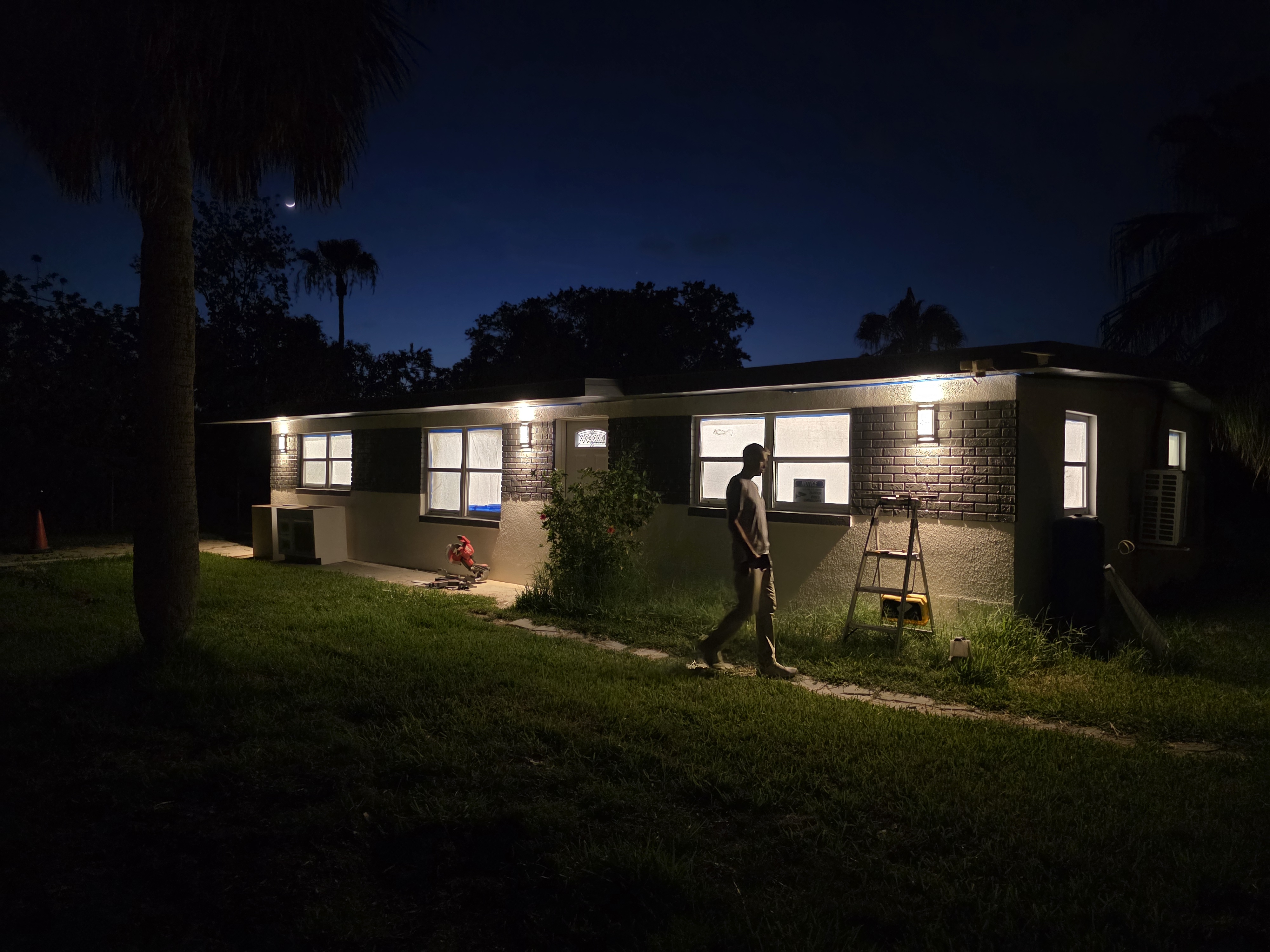 This exterior repaint completely refreshed the look of an older block home. We prepared the surfaces, primed, and applied a high-performance exterior paint system suitable for Florida sun, rain, and humidity. A light main color brightens the façade, while the dark accent on the brick and fascia adds contrast and a more contemporary, horizontal feel. Newly painted trims and coordinated wall sconces finish the composition, boosting curb appeal and protecting the exterior for years to come.